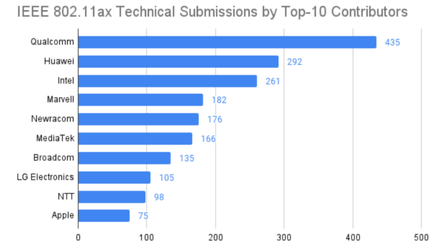 According to OPEN, Unified Patents’ IEEE standards submissions database, over 7,182 technical contributions have been submitted. These top 10 contributors account for 27% of all technical contributions.